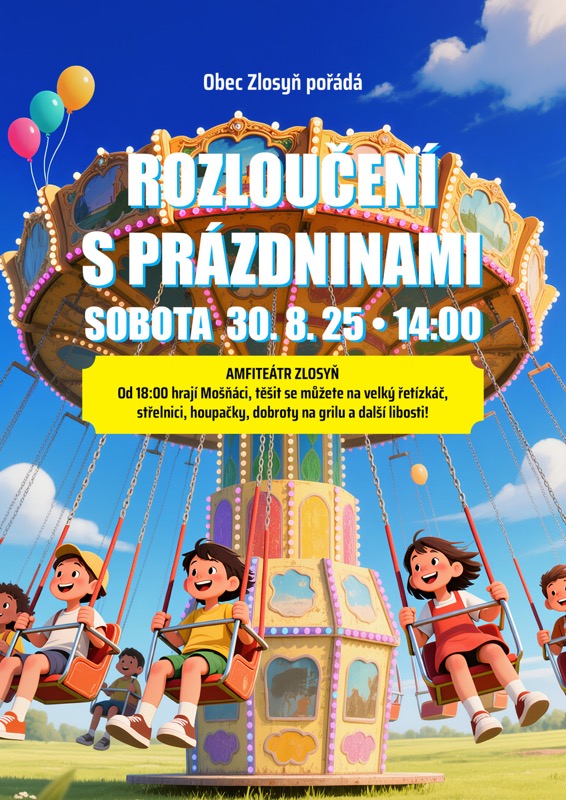 Rozloučení s prázdninami Obec Zlosyň vás zve na akci "Rozloučení s prázdninami" v sobotu 30.8.2025 od 14:00 v amfiteátru před hospodou. Těšit se můžete na kolotoč, střelnici, houpačky a dobroty na grilu. Od 18:00 hraje kapela MOŠŇÁCI.