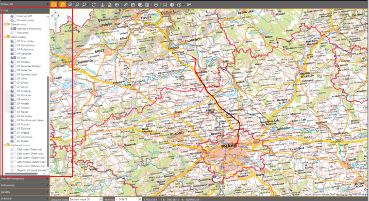 V levém sloupci (níže na snímku obrazovky) je možné zapínat vrstvy. V horní části portálu lze pomocí vyznačené ikony vkládat připomínky.