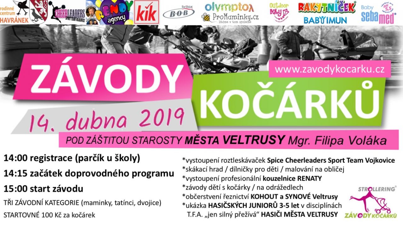 Závody kočárků 14.4.2019 se pod záštitou starosty města Veltrusy konají závody kočárků. Bohatý doprovodný program zajištěn. Více na www.zavodykocaku.cz.